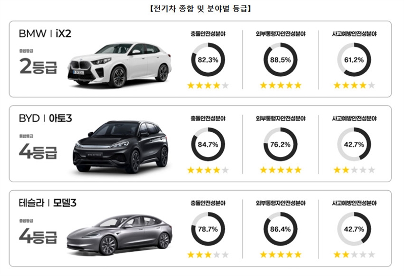 반면 BMW iX2와 KGM 무쏘EV, 기아 타스만은 2등급, 혼다 CR-V는 3등급에 그쳤다. BYD 아토3와 테슬라 모델3는 4등급, 포드 익스플로러는 최하위인 5등급을 받았다.