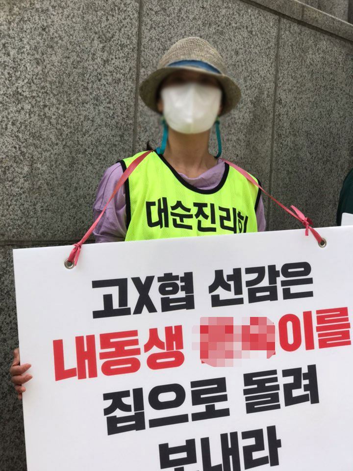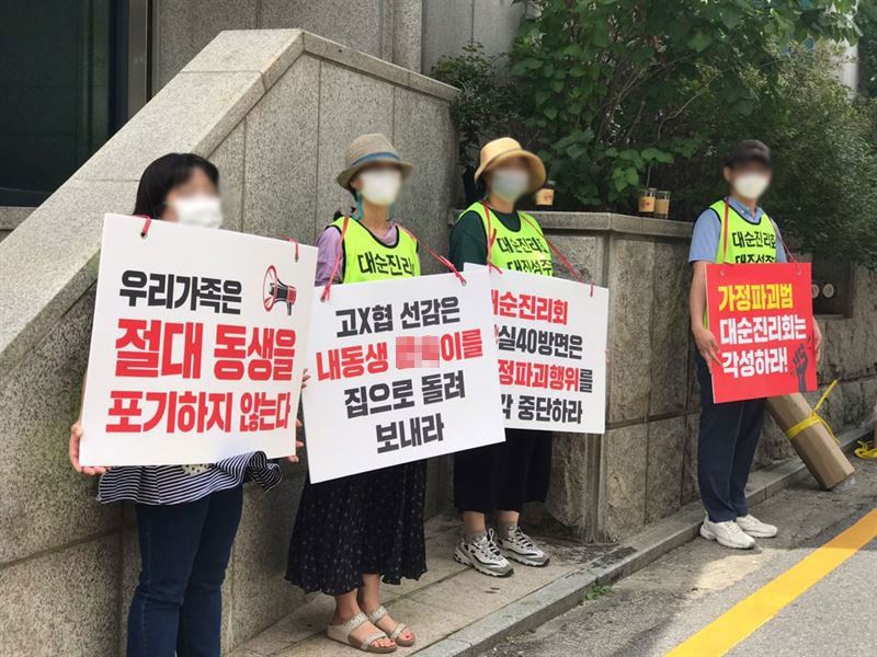 23일 오전 12시께 서울 강남구 역삼동 인근 대순진리회 잠실40방면 사무실 앞에서 대순진리회 피해 가족들이 ‘동생을 집으로 돌려보내 달라’는 피켓을 들고 시위를 하고 있다.