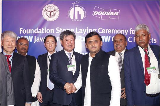 | ▲ 김헌탁 두산중공업 EPC BG장(왼쪽 네번째)과 Akhilesh Yadav 우타르 프라데시 주총리(왼쪽 다섯 번째)가 23일 인도 우타르 프라데시 주 자와하르푸르에서 Foundation Stone Laying Ceremony 행사 제막식 후 기념촬영을 하고 있다. 사진=두산중공업 | |