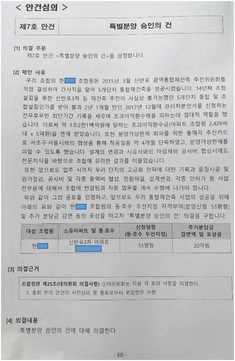 두 번째 논란은 한씨에게 부여하기로 한 거액의 인센티브다. 조합은 지난달 24일 대의원회를 열어 한씨의 동·호수 우선지정 자격 부여(분양신청 53평) 및 추가 분담금 감면 등의 포상 20억원 규모를 허용하고자 ‘특별분양 승인의 건’을 의결했는데, 그 셈법이 과연 타당한지 여부다.